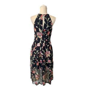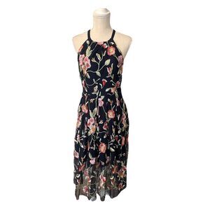 From Vince Camuto, this is a gorgeous navy floral dress with a halter neck. It offers an A-line cut with sheer delicate mesh that is embroidered with a lovely floral pattern that overlays a soft navy lining and zips up the back. Material tag is faded; polyester nylon blend can be seen for fiber contents. Measurements in pictures.