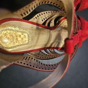Chic red block heels with stylish straps. Perfect for a bold look. Extra cushion supports added!