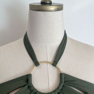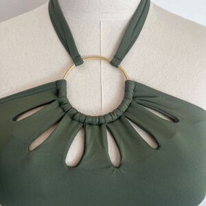Stand out in this Vince Camuto Serengeti halter bikini top in Safari Green, size small. Features bold ring cutout detail and supportive halter neckline for a chic, flattering fit. Sleek, safari-inspired design is perfect for beach days or poolside lounging. Mix and match with neutral or printed bottoms. New with tags. Hardware is a brushed gold.