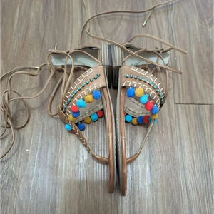Vince Camuto Size 6.5M Balisa Emblished Pom Pom Leather Lace Up Zip Sandal Flats