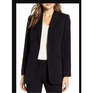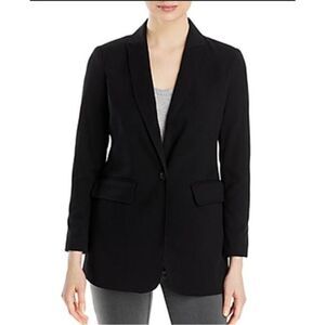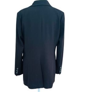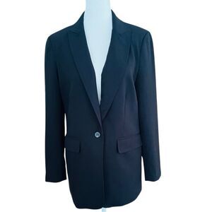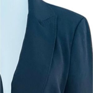 Elegant and versatile black blazer perfect for any occasion. Tailored for a flattering fit. Small shoulder pads, lined, one button closure. Two front pockets. Around the collar and down the lapel there is a tonal running stitch for added detail. Back vent, three buttons on each sleeve. Polyester, elastane, and viscose blend. Great in any season.