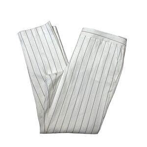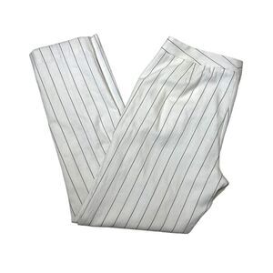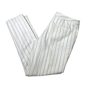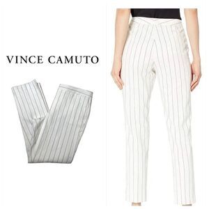 Vince Camuto Womens Pinstripe Front Zip Ankle Pants Features an ivory white with think black pinstripes. Straight leg. Slightly cropped ankle fit. Hook and zipper fly closure. Side pockets. Nylon, viscose, elastane, polyester blend. Lined on the upper portion. Measurements in pictures.