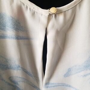 A swirly marbled Vince Camuto tank top with a small keyhole opening in the back, closed with a Vince Camuto stamped button.
