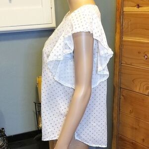 White color, fun blue small pattern, scoop neckline, flutter sleeves, beautiful lace detailing on front and along sleeves hem, keyhole and button closure at back.