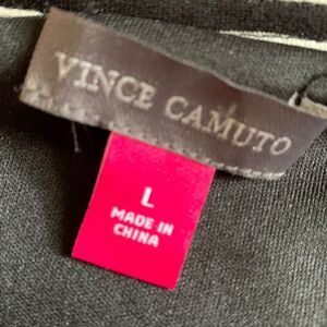 Vince Camuto black and white striped dress with decorative front tie, overall stretch, fully lined and no pox. Armpit-to-armpit 20, sleeve 6”, length 39” and waist 38”.