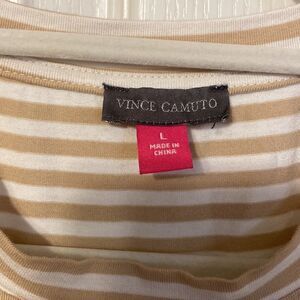 Classic T by Vince Camuto. Short Sleeve., round neck. Machine washable. Worn twice. Size Large. Nonsmoking home. Tan and white stripe.