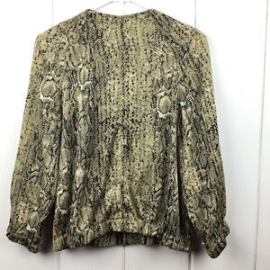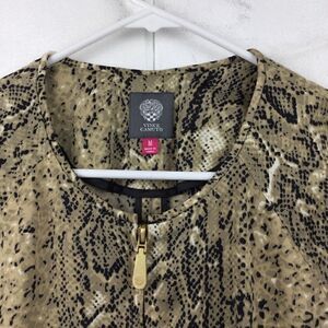 Vince Camuto Tan, Black & White Snakeskin Zip Front Bomber. Size - Medium. 97% polyester, 3% spandex. Jacket zips in front, has two front pockets & has elastic hems on sleeves & waist. This super cute animal print jacket has no holes or stains.