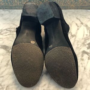 These boots are in excellent pre-owned condition. They are barely worn, but there is some discoloration on one heel. They are black suede with about a two inch heel. The bottoms are rubber for good traction. Also, the western flair is so cute!
