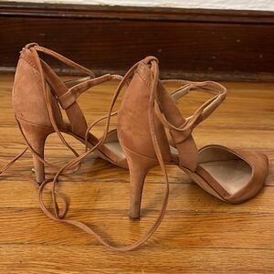 Pointed-toe dress pump featuring two-piece suede upper and ankle wrap no