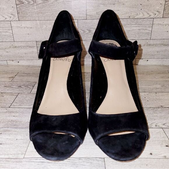 Vince Camuto black suede peep toe mary jane pump/heel. ^