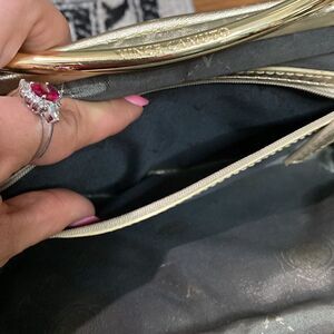 Very nice condition, clean, timeless style. Inside pocket with zipper. Magnetic top snap closure. Can attach a gold chain to make this a shoulder/crossbody bag.