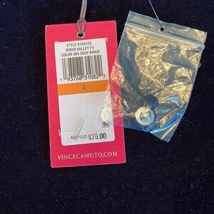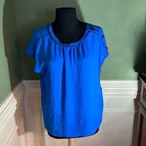 This cute royal blue blouse Vince Camuto business casual with black buttons and black stitching on the outside with a button back