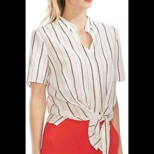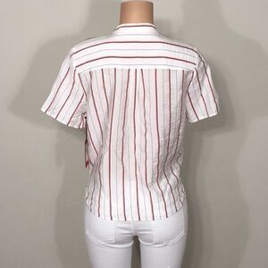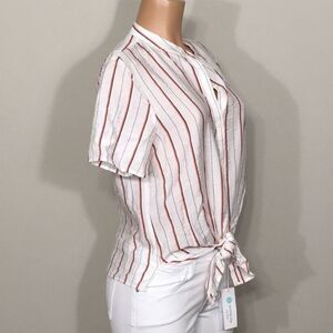 This is the beautiful retro-striped shirt. I bought one for myself I love it so much! The fabric is lightweight but has a silky crepe feel to it. Short sleeves. Button up and ties at the waist. Longer in the back to come over your hips. I am a small but a small or medium could wear this because it ties and has a blousy look to it