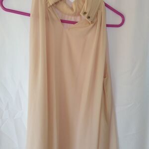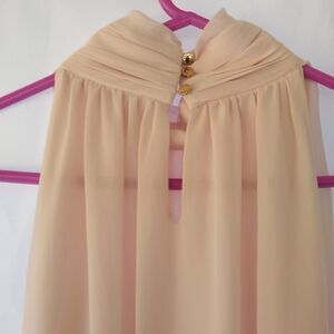 Peach colored sleeveless top, semi sheer, has high choker style collar with 3 small buttons. D