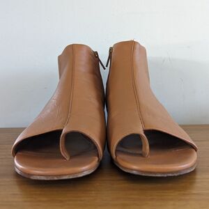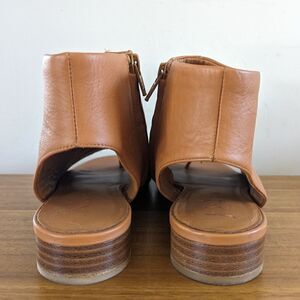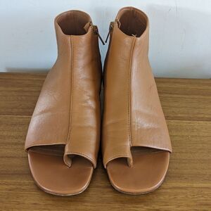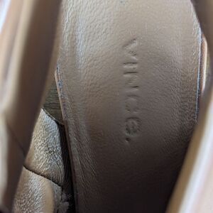 Description: Vince Tan Leather Toe Loop Sandals, 6 ½ Coastal Preppy Academia Minimalist Quiet Luxury, vero cucio mark on the sole, soft leather vamp, minimalist and modern look with rounded heel, discrete marks with some sticker residue on the insole (photos included) but overall in great condition, side zipper, some wear on the soles, ships without box