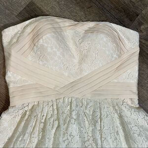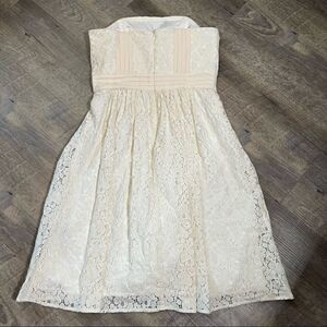 Details: Beautiful strapless fit and flare lace dress. Cream colored, with darker cream accents up top. Zips up the back, lined, lightly padded bra.