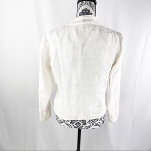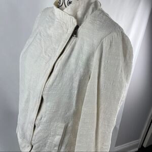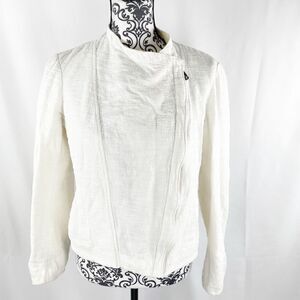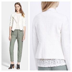 Vince Stretch Frise Asymmetrical Scuba Jacket size small. Ivory color with asymmetrical zipper. Mock collar and two faux slash pockets. Cotton material and fully lined. No holes or stains. Lightweight!