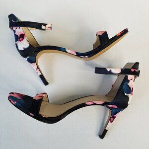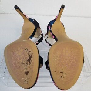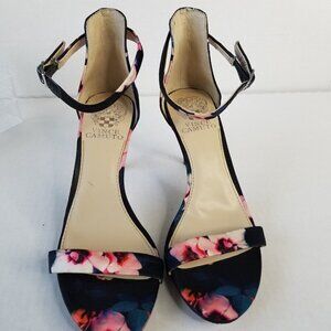 Vincent Camuto all over floral Print Fabric Jesta High Heel Sandals. Ankle strap closure peep toe high heel leather sole fabric upper stiletto shoes 3" high.