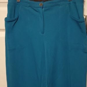 Vincente casual yet stylist, two piece ruffled front pantsuit. Pants have pockets and button and zipper closure. Waist 16", inseam 33". Size M. Jacket has ruffled front and hem. Button and loop closure with subtle studs down the front. Armpit to armpit 23", length 26". Size XL. NOTE THAT PANTS AND JACKET ARE DIFFERENT SIZES. Color is peacock