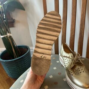 Good used condition gold metallic platform sneakers. No listed size, but I'm a size 9 and there's a little extra room for me, so I'd say like 9-9.5. Wear throughout the soles and some creasing on the material