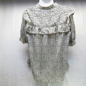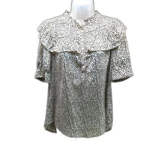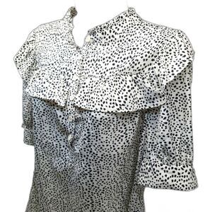Vine & Love Cheetah Print Blouse 1/ 4 Button up, Ruffle Front/ Back Women's Large. White/ Black.
