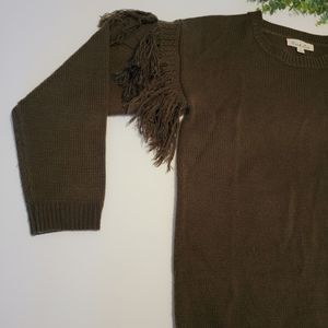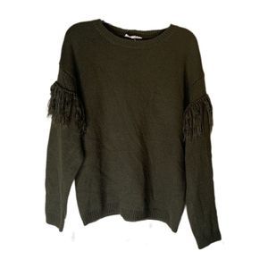 Perfect for fall! Olive green sweatshirt by Vine & Love featuring fringe at the sleeves and an all over comfy tight knit.