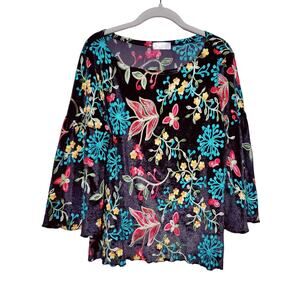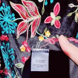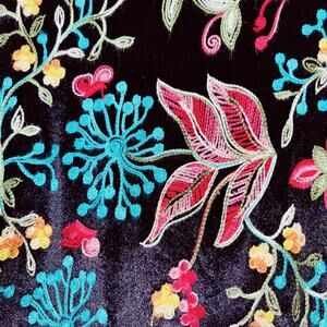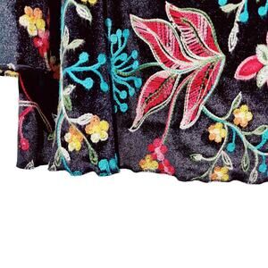 Vine Street women's black velvet shirt with colorful all over embroidery. Round neck, lettuce hem, and flared 3/4 length sleeves.