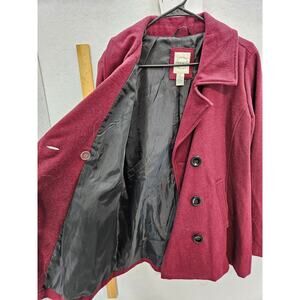 Vine & Valley maroon, polyester peacoat with a buttoned strap at the lower back, size L