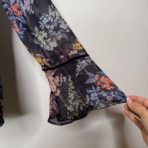 ✨ Rich embroidery and velvet accents bring luxe texture to this sheer floral blouse with metallic shimmer