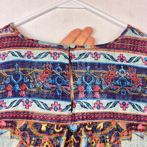 Abstract boho print with embroidery detail along the neckline