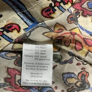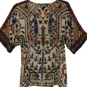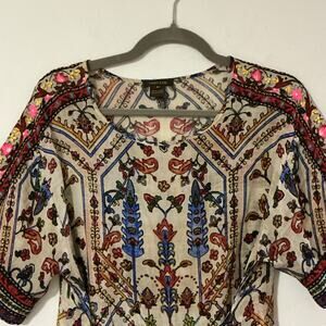Pre-owned in excellent condition — looks like new with no flaws. Beautiful bohemian floral print in earthy tones with vibrant embroidered sleeves and a striped tie-front waist that flatters your shape. Lightweight and airy, perfect for spring and summer wear.