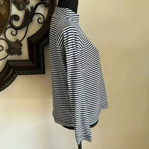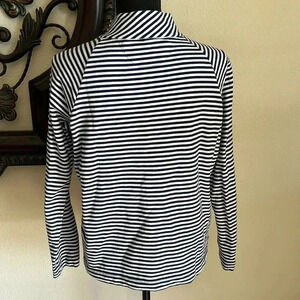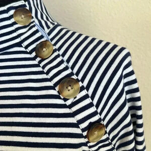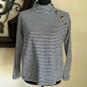 Long sleeve, mock turtleneck navy blue and white striped pullover top with 4 accent buttons on left shoulder. In great pre-worn condition! No holes or stains. Size: Medium