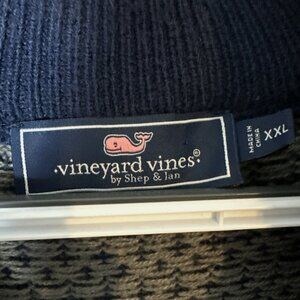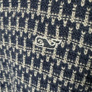 The Vineyard Vines 1/4 zip Knit Sweater in size XXL is a stylish and comfortable garment perfect for casual occasions during the winter, fall, and spring seasons. The sweater features a classic geometric blue and gray design with a mock neck and long sleeves, making it suitable for everyday wear. Made of knit fabric, this pullover sweater with the Vineyard Vines Whale logo accent is machine washable for easy care. With a regular fit and 1/4 zip style, this Vineyard Vines sweater is a versatile addition to any man's wardrobe.