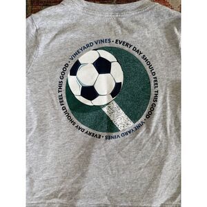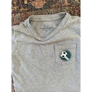Vineyard Vines 2t toddler boy grey soccer graphic tee shirt. Side chest pocket. 2 small pinholes as pointed out in last photo hence low price