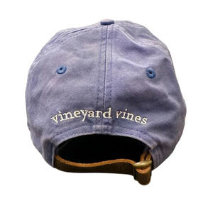 This Vineyard Vines Whale Flag Baseball Cap w/ Leather Strap in Faded Blue features American Flag embroidery in the shape of the Vineyard Vines whale on the front, signature text above the back opening, and an adjustable leather strap. One size fits most.