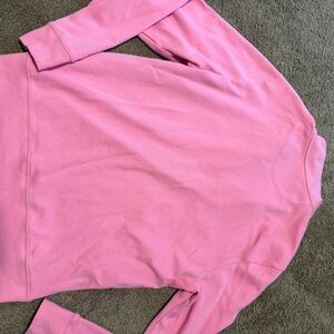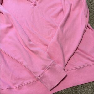 Pink pullover featuring a quarter-zip design. Contrasting navy collar adds style.