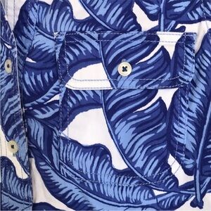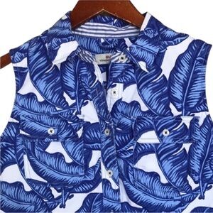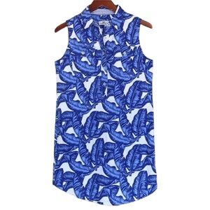 Vineyard Vines, Margo, sleeveless, tank, shirt dress. White with Blue Banana Leaf print. Collared. Curved hem. 2 front chest pockets. 98% cotton 2% spandex. Size 0. See photos for measurements to ensure fit.