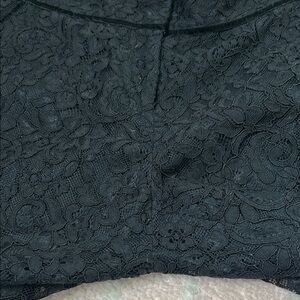 Chic black lace pants with a stylish design. Perfect for any occasion. Thin velvet trim around waistband and pockets.