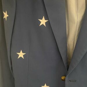 Stylish blue blazer with white star pattern. Perfect for a bold look. Embroidered white stars, striped lining and double back vents. Pre-owned and never worn in excellent condition.