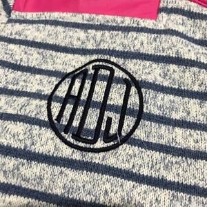 This pullover is in excellent condition! Monogram on lapel. Navy blue and gray stripes with pink shoulders. Quarter zip pullover. Women’s size extra small. 11.4.22 G
