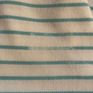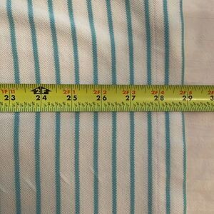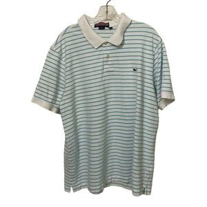 White and blue striped, 100% pima cotton, pullover short sleeve collared polo shirt by Vineyard Vines in a men's size extra large (XL). Extra button sewn to care tag. There is a small area where the blue stripe has faded a bit. See photo. No very noticeable when worn. Machine washable. Approximate measurements shown in photos. Pre-owned with some signs of wear from normal use.