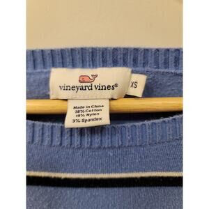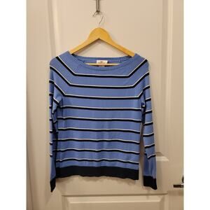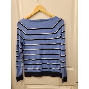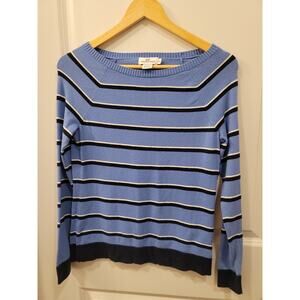 Blue and white striped sweater with ribbing at boatneck with navy bands at cuffs and hem.