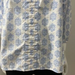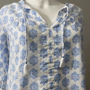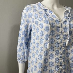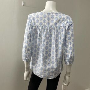 Stylish blouse with blue floral pattern. Features a V-neck with drawstrings. Three-quarter sleeves. Perfect for casual wear.