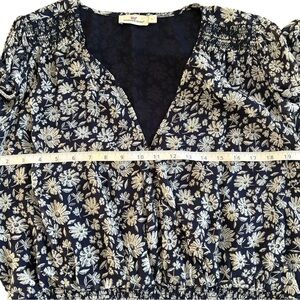 Elegant long sleeve dress with a floral design. Features a blue and white color scheme. Perfect for any occasion. Stock photos show true color of the blue. It’s Navy and white.