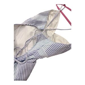 This Vineyard Vines one-piece swimsuit showcases a classic silhouette with a sweetheart neckline and thin spaghetti straps. The elegant blue and white color scheme complements its form-fitting design, making it perfect for both swimming and lounging. Vineyard Vines | Seersucker Sconset One Piece Swimsuit Blue White size XXS pre-owned good condition