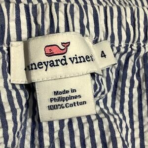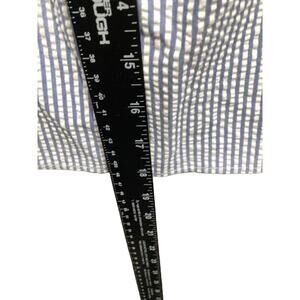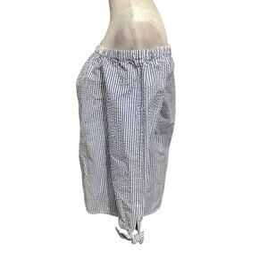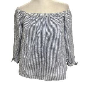 Off-the-shoulder design. Blue and white stripes. Three-quarter sleeves with tie detail.