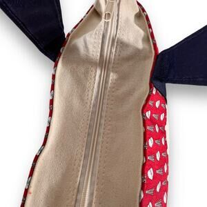 Vineyard Vines heavy-duty canvas tote in coastal blue and ivory with unique hard hat & oil rig trim print. Zippered top, gingham lining, interior zip and slip pockets, and exterior slash pocket. Structured 15x12x5 size with 11" strap drop.