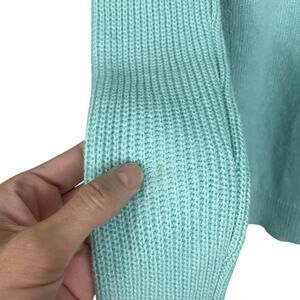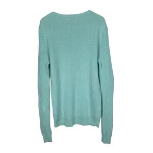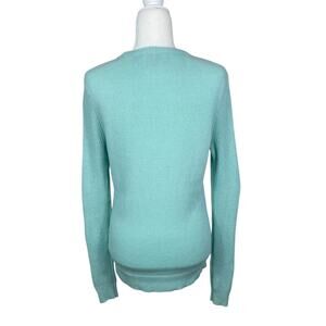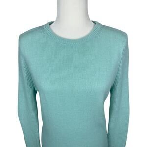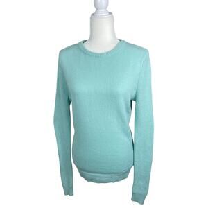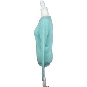 Cashmere, lambswool and angora blend crew neck sweater. Ribbed sided, cuffs and hem. Beautiful and super soft and cozy. 35% viscose, 29% lambswool, 20% nylon, 8% cashmere, 8% angora. Mint green in color. Size medium. Please see photos for measurements. There is a small mark to left elbow. Please see photos.