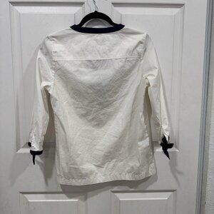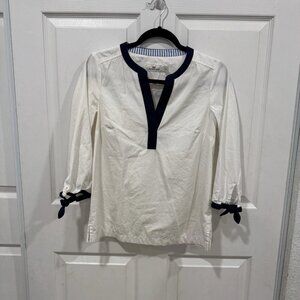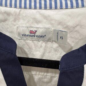 This is a Vineyard Vines Color Block Savannah Popover Top in size Xsmall (XS) for women. The top features a colorblock design in white, perfect for a preppy look. It is a blouse style with a regular fit, tailored for a comfortable and stylish wear. Ideal for casual or semi-formal occasions, this top embodies the classic and timeless aesthetic that Vineyard Vines is known for.