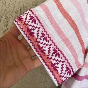 Vineyard Vines, Cotton Linen Blend, Embroidered Detail, Pink Stripe Gustavia Top. Embroidered detail around neckline and sleeve. Pleated detail around neckline. White with pink stripes, color Cara Cara. Short sleeve. Notched V neckline. 55% linen 45% cotton. Size XS. See photos for measurements to ensure fit.